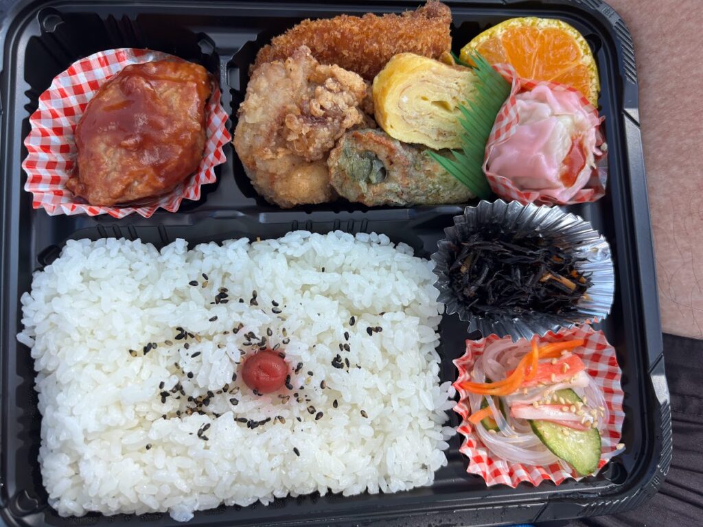 弁当を引き換え、木陰でお昼を食べました。妻は近くのセブンイレブンでのり弁当を買っていました。